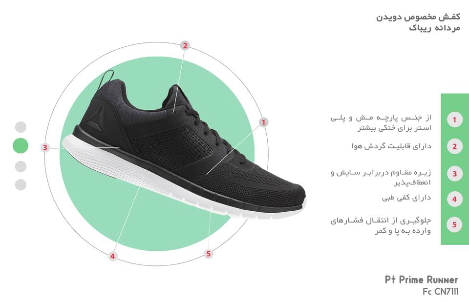 ریباک یکی‌از مشهورترین برندهایی است‌که با تولیدات منحصر‌به‌فرد خود در‌زمینه کالاهای ورزشی فعالیت دارد. «کفش مخصوص دویدن مردانه‌ ریباک مدل PT Prime runner FC cn7111» رویه‌ای از‌جنس پارچه ‌مش و پلی‌استر دارد که با ایجاد وزنی سبک به آقایان ورزشکار کمک می‌کند تا لحظاتی خوش‌را در‌زمان ورزش تجربه کنند. درعین‌حال استفاده از این الیاف در‌ساخت این‌کفش باعث افزایش مقاومت آن دربرابر پوسیدگی حاصل‌از استفاده‌ مداوم شده؛ به‌نحوی که آن را دربرابر پوسیدگی حاصل‌از سایش و اصطکاک با‌سطوح مختلف تاحدی مقاوم ساخته است. پارچه‌ به‌کاررفته در‌ساخت رویه‌ این‌کفش ساختاری مشبک دارد که با ایجاد گردش هوا در سطح داخلی، علاوه‌بر خنک نگه‌داشتن سطح پوست شما، از تعریق زیاد نیز جلوگیری خواهد کرد. این‌کفش دارای کفی نرم و طبی است که با جلوگیری‌از واردشدن فشار زیاد به‌پا، از خستگی بیشتر شما در‌زمان فعالیت‌های ورزشی جلوگیری خواهد‌کرد. همچنین زیره به‌کاررفته در این‌کفش انعطاف‌پذیر و مقاوم بوده که به‌واسطه‌ مقاومت زیادی‌که دربرابر سایش حاصل‌از تماس با سطح زمین دارد، آن‌را برای استفاده‌ بلندمدت مناسب ساخته است. این زیره قابلیت ارتجاعی خوبی داشته و آج‌دار است و از لغزش جلوگیری خواهد کرد.