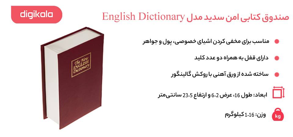 صندوق کتابی امن «Sadid» (سدید) مدل «English Dictionary» برای محافظت هرچهبیشتر از اسناد و مدارک مورد استفاده قرار میگیرد. این مدل برخلاف صندوقهای بزرگی که در بازار موجودند، بسیار کوچک و کموزن است. طراحی این صندوق به شکل یک کتاب قطور است که شباهت زیادی به یک دیکشنری دارد. زیر جلد کتاب درِ دیگری وجود دارد که زیر آن محفظهی نگهداری وسایل قرار داده شده است. روی این در دوم، قفلی تعبیه شده است که برای باز و بستهکردن آن باید از دو کلیدی که درون جعبه قرار گرفته، استفاده کنید. با قفلکردن این صندوق و قراردادن آن بین کتابهایتان، خیالتان از بابت وسایل باارزشتان راحت خواهد بود؛ چراکه از یک طرف تشخیص صندوق بودن کتاب مشکل است و از طرف دیگر حتی در صورت تشخیصدادن آن، بازکردن قفلش کار آسانی نیست. اگر همیشه در وقت خروج از خانه یا در مهمانیهایتان نگران دزدیدهشدن یا سرککشیدن دیگران به وسایل شخصیتان هستید، با تهیهی این صندوق از گردش و مهمانی خود لذت بیشتری ببرید.