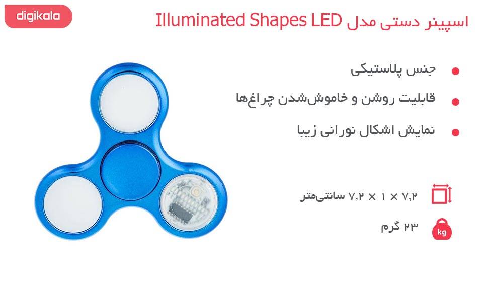 اسپینر دستی مدل «Illuminated Shapes LED» با طراحی جذاب و منحصربهفردش، نظر شما را به سمت خود جلب میکند. این اسپینر دستی ابعادی 7.2 × 1 × 7.2 سانتیمتری و 23 گرم وزن دارد که بیشک این وزن کم را باید مدیون جنس پلاستیکیاش بود. اسپینر دستیIlluminated Shapes را با توجه به این ابعاد و وزن میتوانید بهراحتی درون جیب یا کیفتان قرار دهید و هر کجا دوست دارید، به همراه خود ببرید. از ویژگیهای منحصربهفرد این اسپینر دستی میتوان به چراغهای LED اشاره کرد که هنگام روشنشدن، طرحهایی از اشکال هندسی را به تصویر میکشند. این اسپینر دوستداشتنی درون یک بستهبندی مقوایی به ابعاد 9 سانتیمتر قرار گرفته است تا بتوانید آن را به عزیزانتان هدیه دهید و آنها را حسابی خوشحال کنید. گفتنی است اسپینر اشکال نورانی در هشت رنگ مختلف در سایت ما موجود است که میتوانید متناسب با سلیقهتان هرکدام را دوست داشتید، تهیه کنید و از داشتنش لذت ببرید. ابعاد کوچک، وزن کم، جنس پلاستیکی، رنگبندی متنوع و داشتن چراغهای LED همگی از مزایای اسپینر دستی Illuminated Shapes LED هستند که به هنگام خرید باید به آنها توجه کرد.